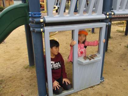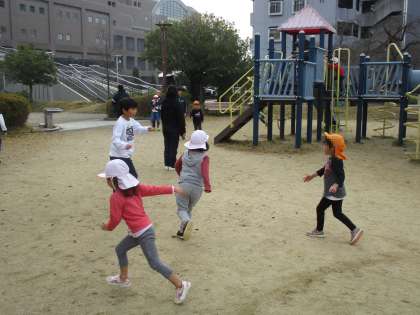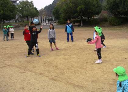 今日は保育交流で公園に遊びに行きました。ドッチボールや鬼ごっこをしたり,遊具で遊んだりしました。