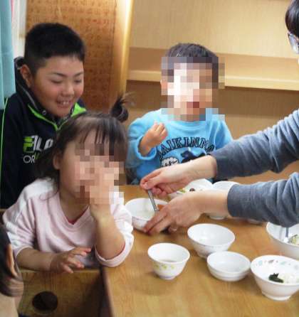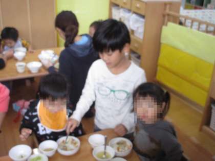 4年生のおにいさんとおねえさんと一緒ならご飯もいっぱい食べられるよ。