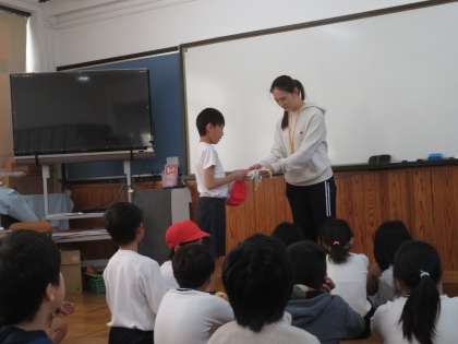 そして,教育実習の先生の最後の話になりました。先生も子どもたち全員にメッセージを書いてきていました。一人一人手渡され,子どもたちはとてもうれしそうでした。