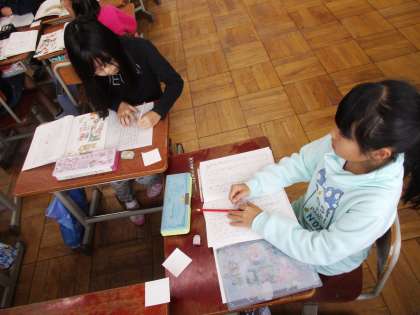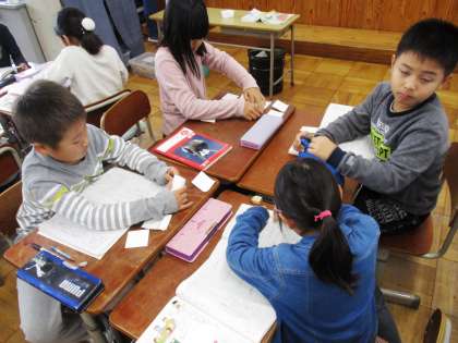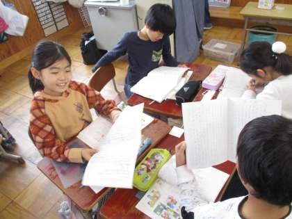 自分たちが考えた物語をグループで読み合って,アドバイスをしています。「○○さんの考えた物語,おもしろい!」と楽しみながら,読んでいました。