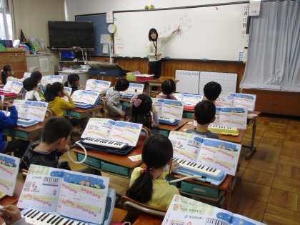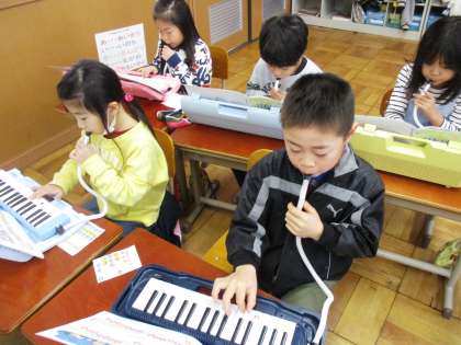 指づかいに気をつけながら『きらきらぼし』の演奏をしています。