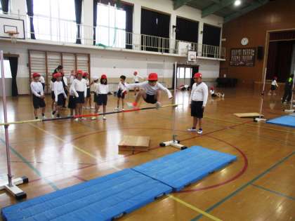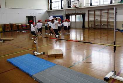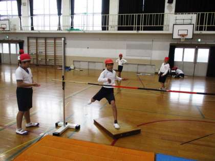 高跳びをしています。少しこわさもありますが,勇気をふりしぼって「えいっ!」と跳んでいました。