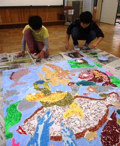 ちぎり絵に絵の具で彩色して,水辺の生物の大きな絵ができました。