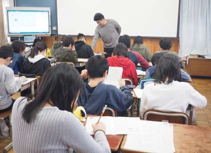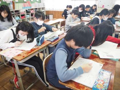 これまでに学習した内容を復習しています。分からないところは教え合いながら進めています。