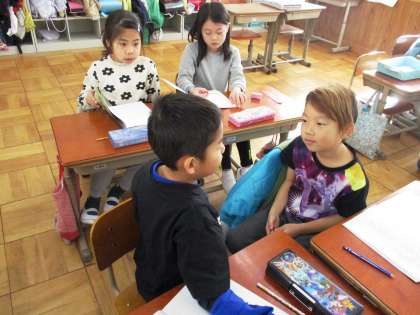 ようすを表すことばについて学習しています。どのように仲間わけできるか一人で考えた後,ペアで話し合って考えました。