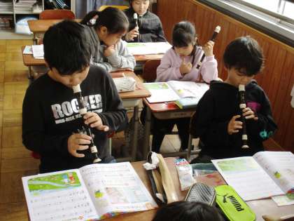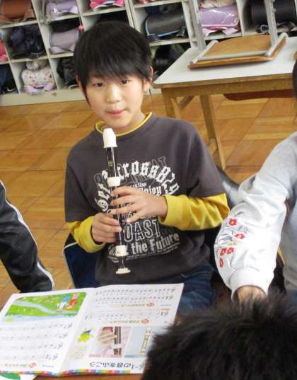 リコーダーの演奏をしています。指遣いに気をつけて,きれいな音が出るようになってきました。