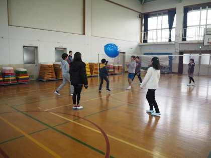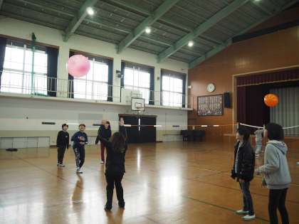東総合支援学校の児童と交流学習を行いました。大きい風船を使ってソフトバレーを行いました。