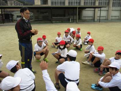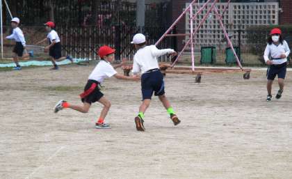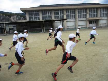 タグラグビーを始める前に,タグ鬼をしています。ステップを意識しながら逃げる練習です。寒い1日ですが,みんな元気に走り回っています。