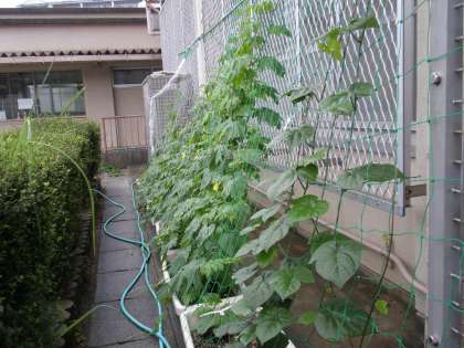 朝,「緑のカーテン」を見てみると,一段と成長していました。ツルも週末で10センチ以上のびています。