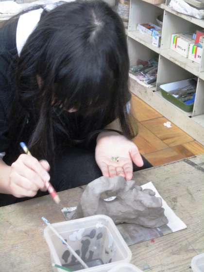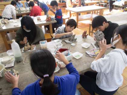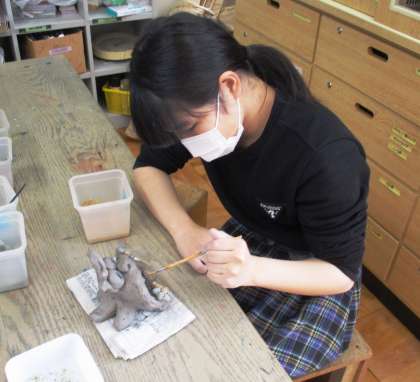 それぞれ何の守り神にするかを考えながら作ったシーサーに,ガラスの破片や絵の具で装飾をし,卒業記念に校章のハンコで型を付け,仕上げです。1200度の窯で焼いてもらったら,どんな仕上がりになるのか楽しみです。ぜひ3月3日〜5日の作品展でご覧ください。