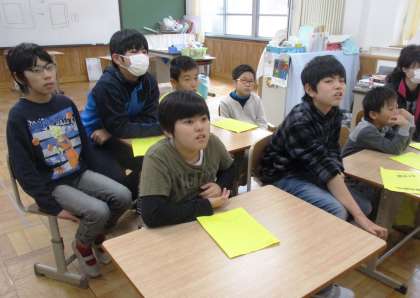 みんなで話し合い,セリフを考えながら練習しています。