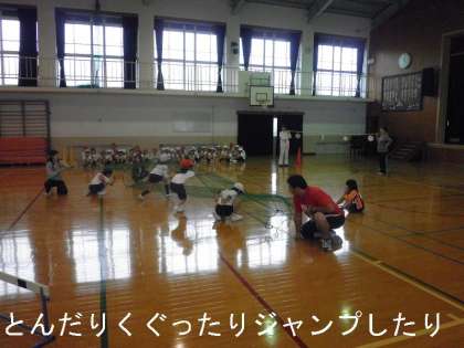あいにくの雨で,今日の運動会練習は,体育館で行いました。学年種目「野をこえ山こえ」のやり方を覚え,短い距離でしたが実際に走ってみました。