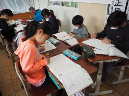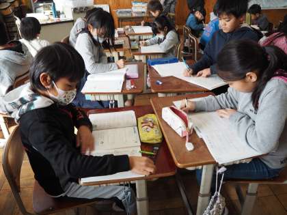 これまで学習したことをグループに分かれて復習しています。分からないところは教え合いながら進めていきます。
