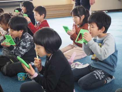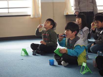 歯みがきの歌に合わせながら歯みがきをしました。歯科衛生士さんのお手本を見ながら,きれいな歯を目指して真剣にみがきました。