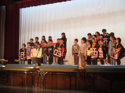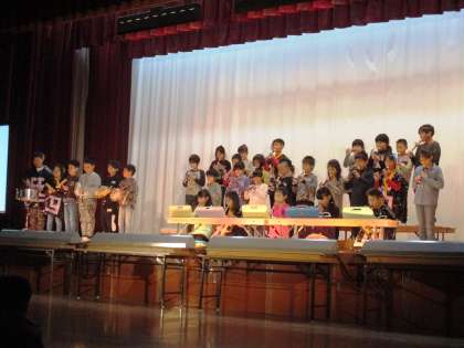 3年生は,初級学校との交流から学んだことについて元気いっぱいに発表しました。また,色々な国の歌や楽器を使った合奏も行いました。