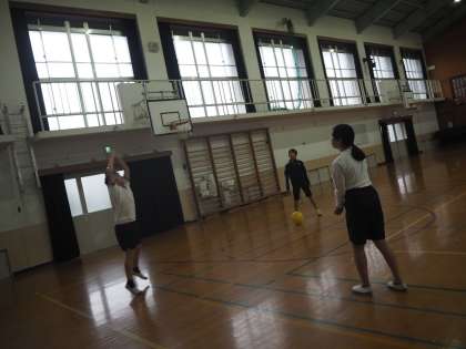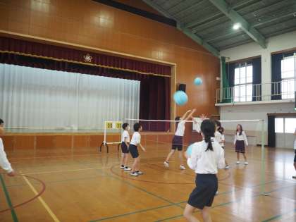ソフトバレーを行っています。チームに分かれてパス練習を行いました。声をかけ合ってボールをつないでいきます。
