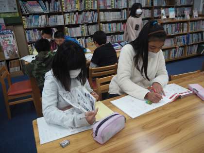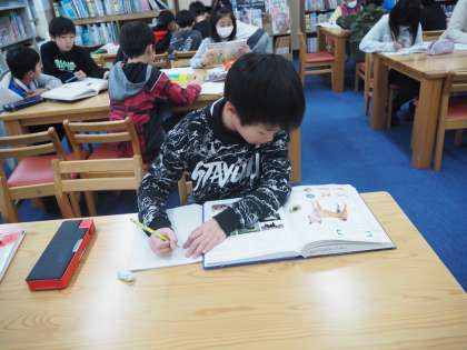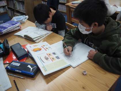 自分たちが疑問に思ったことをテーマに,それぞれが研究を進めていきます。今日は図書館での調べ学習を行いました。調べたことは,ノートにまとめていきます。