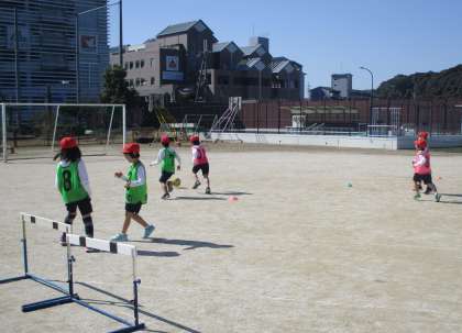 ボールけり遊びを行っています。今日は,チームに分かれて試合を行いました。チームのみんなと力を合わせてゴールまでボールを運びました。