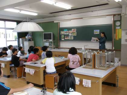 理科室での授業は,実験教材や観察教材がいっぱいです。みんな興味を持って意欲的に学習しています。