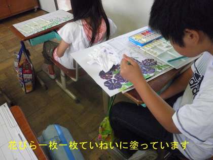 自分の気に入った「花」を中心にバックの景色を描いています。今日は中心になる「花」の色を塗りました。花びら一枚一枚ていねいに混色をして塗っていました。