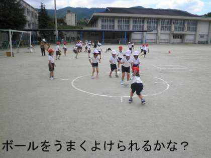 体育の時間にみんなで楽しく「ころがしドッジ」をしました。円の中から出ないで,そしてボールに当たらないように動き回り,運動量たっぷりの「ころがしドッジ」になりました。