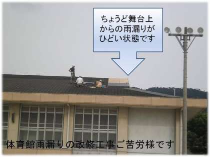 5月に,南校舎3階と体育館に雨漏りが発生して困っていることをお伝えしましたが,運動会前の長雨がやんでから,改修工事をしていただいています。