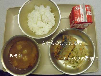 「さわらのたつたあげ」「キャベツのごまに」の米飯給食でした。