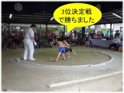 決勝トーナメントでも,圧倒的な強さで準決勝まで進みました。しかし,相手を押し出そうとしたとき,惜しくも「勇み足」で負けてしまい決勝戦には進めませんでした。 でも3位決定戦では見事に勝ちました。
