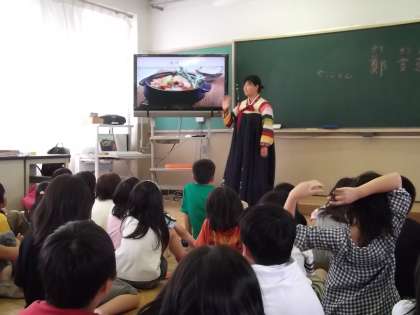 今日、三年生は韓国にルーツをもつ鄭先生にきていただき、韓国の文化や挨拶を勉強しました。身近な国ですが、知らないこともたくさんあり、子どもたちは、とても関心を持って、お話を聞いていました。最後に、みんな口々に楽しかったと語り、鄭先生に韓国語で挨拶をして、教室に戻りました。