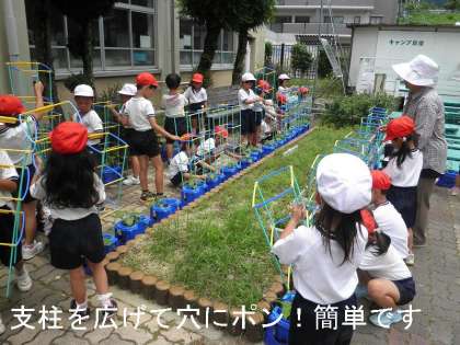 今日,みんなで支柱を取り付けました。最近の支柱は簡単で,広げて穴に入れたらOKです。全員がつけ終わるのにわずか5分たらずでした。