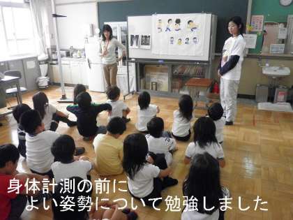 6月の身体計測がありました。身長・体重測定の前に,養護の先生から「よい姿勢」のお話しがありました。