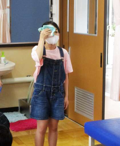 予防の観点から,今回はタオルで目を隠して検査しています。