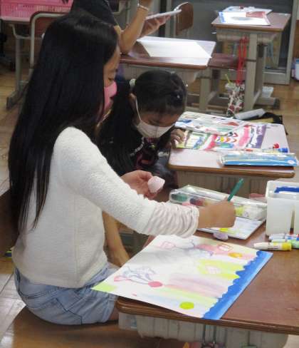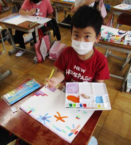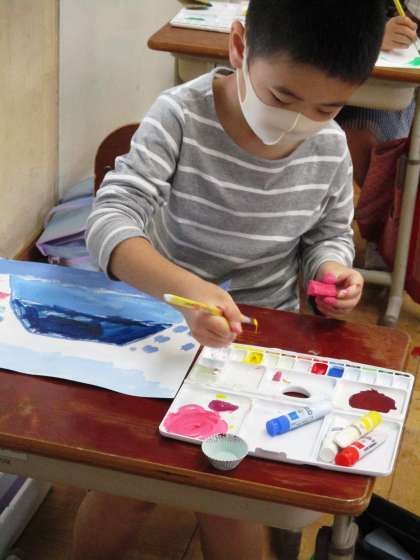 赤,青,黄の3原色の絵の具を使って混色の工夫をしています。