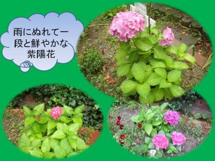 昨夜からの雨にぬれて,今朝のアジサイは一段ときれいです。