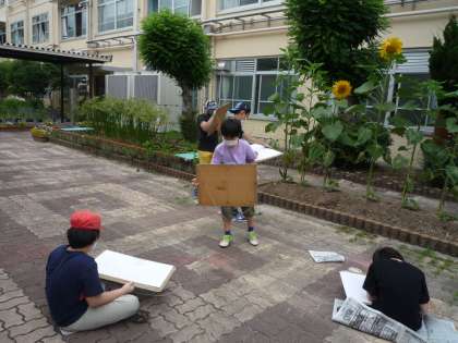なので!みんなで画板をもってヒマワリの絵を描きに行きました。