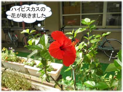 今朝,玄関前のプランターに並べて育てている「ハイビスカス」の花が咲いていました。真っ赤の大きな花できれいです。