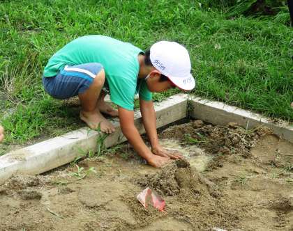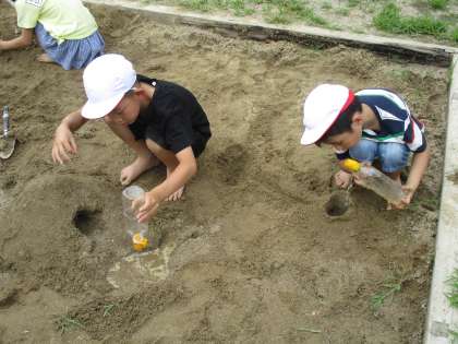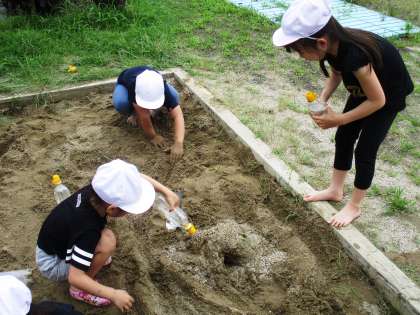 砂場で造形遊びをしました。砂の感触も感じながら,トンネルを作ったり,水を入れて川にしたり…