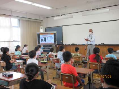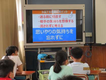 4年生はゲストティーチャーに来ていただいてケータイスマホ教室を行いました。SNSはとても便利なものだけれど,ふとしたきっかけで思いもよらないトラブルに巻き込まれることもあるというお話でした。「こわい」「えーっ」とつぶやきながら,真剣に話を聞いていました。