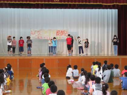 7月13日(月)の1校時,今年度最初の児童集会を行いました。この児童集会は,各委員会の委員長と4年生以上の代表委員会で構成されている「児童会本部」が企画・運営を行います。