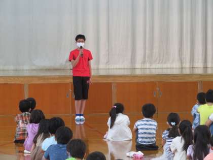 スローガン発表の後は,各委員会からのお知らせがありました。発表した人のほとんどが,全校児童の前で初めてでしたが,「さすが6年生」と思わせてくれる発表でした。これから先がますます楽しみです。