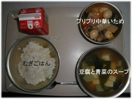 具だくさんの「ぷりぷり中華いため」&とうふたっぷりの「豆腐と青菜のスープ」&「むぎごはん」でした。