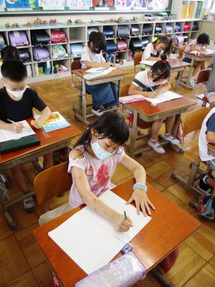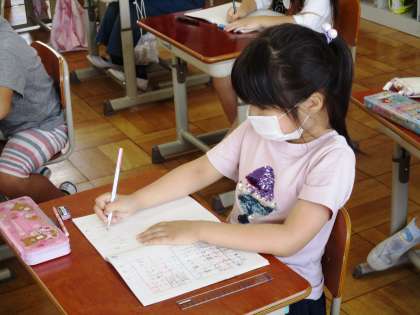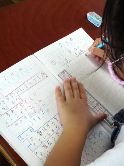 2けた+2けたの筆算の学習をしています。今回はくり上がりがある時,どのように筆算するのかを学習しました。ノートの使い方も教えてもらって,しっかり書けるようになりました。