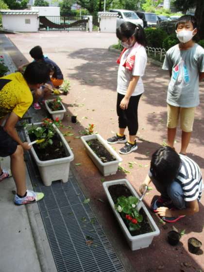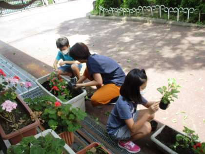 みんなのおかげで,中庭がきれいな花に彩られました。
