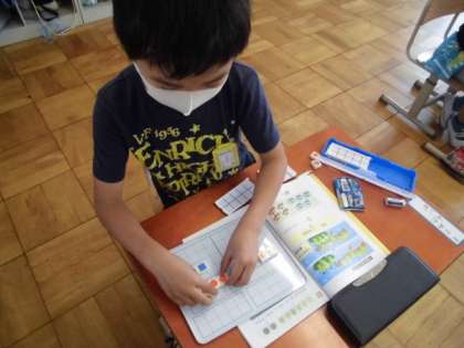 数図ブロックを使って、ひき算の学習をしました。色わけしながら数図ブロックを使うと、とてもわかりやすかったですね。
