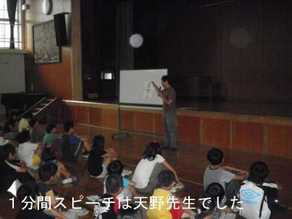 まずは先生の1分間スピーチです。5年の天野先生が「まねる」と「まなぶ」というお話しをしてくださいました。