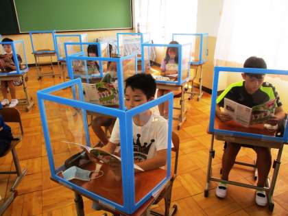 感染防止対策として卓上シールドを設置し,歌唱をしました。久しぶりに子どもたちのきれいな歌声が聞こえてきました。