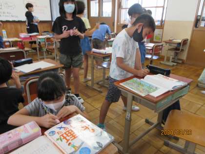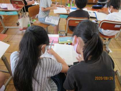 「とじこめた空気や水」の学習のまとめのに取り組みました。教科書を見ながらノートに見やすくまとめてテスト勉強に生かします。友だちのまとめたノートを見てコメントのやりとりもしました。