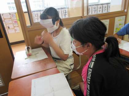 「かがやき学習」で,目の見えない大変さについて学習しました。アイマスクをして,目をかくした状態で友だちと自己紹介し合っていました。