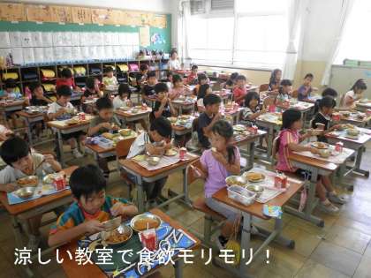 猛暑です。教室内は35度です。集中して授業に取り組めません。エアコンをフル回転して,涼しい教室で子どもたちは学習しています。給食時間も涼しく,食が進みます。