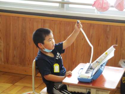 初めての鍵盤ハーモニカです。『鍵盤ハーモニカくん』から届いたお手紙に書かれていた5つの約束を守りながら,しっかり練習するととっても上手になるそうです。